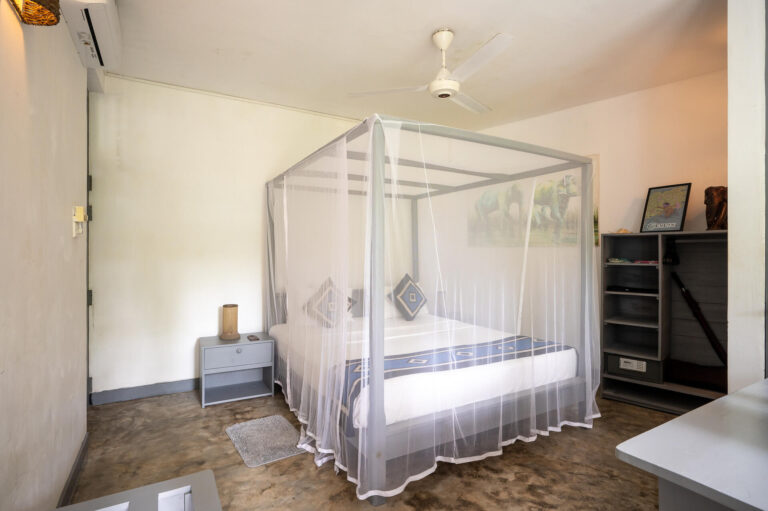 This first floor Air Conditioned room faces north and is tucked away from the morning sun. Featuring a four post king bed and patio with lounge you can sit on your bed and watch the wildlife entertain you. How often do you get to view the full moon whilst showering in an open-air jungle bathroom?