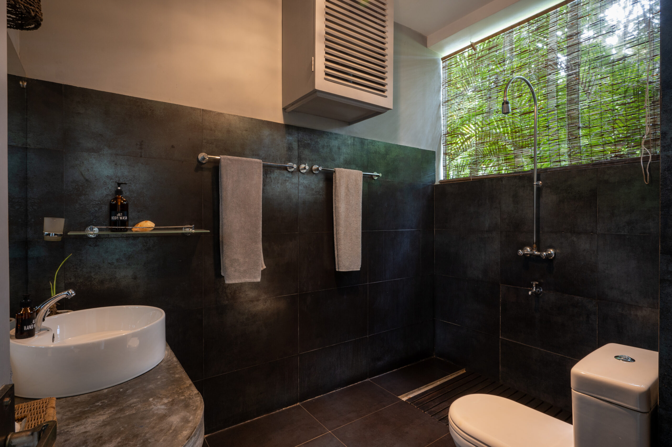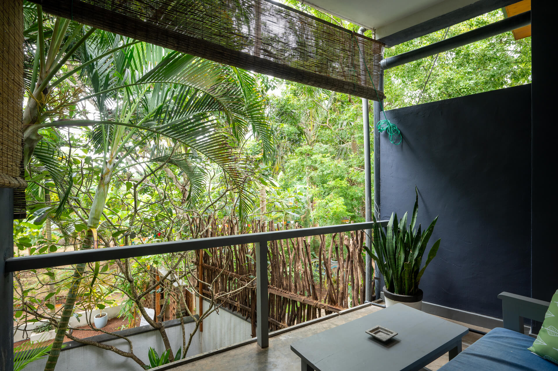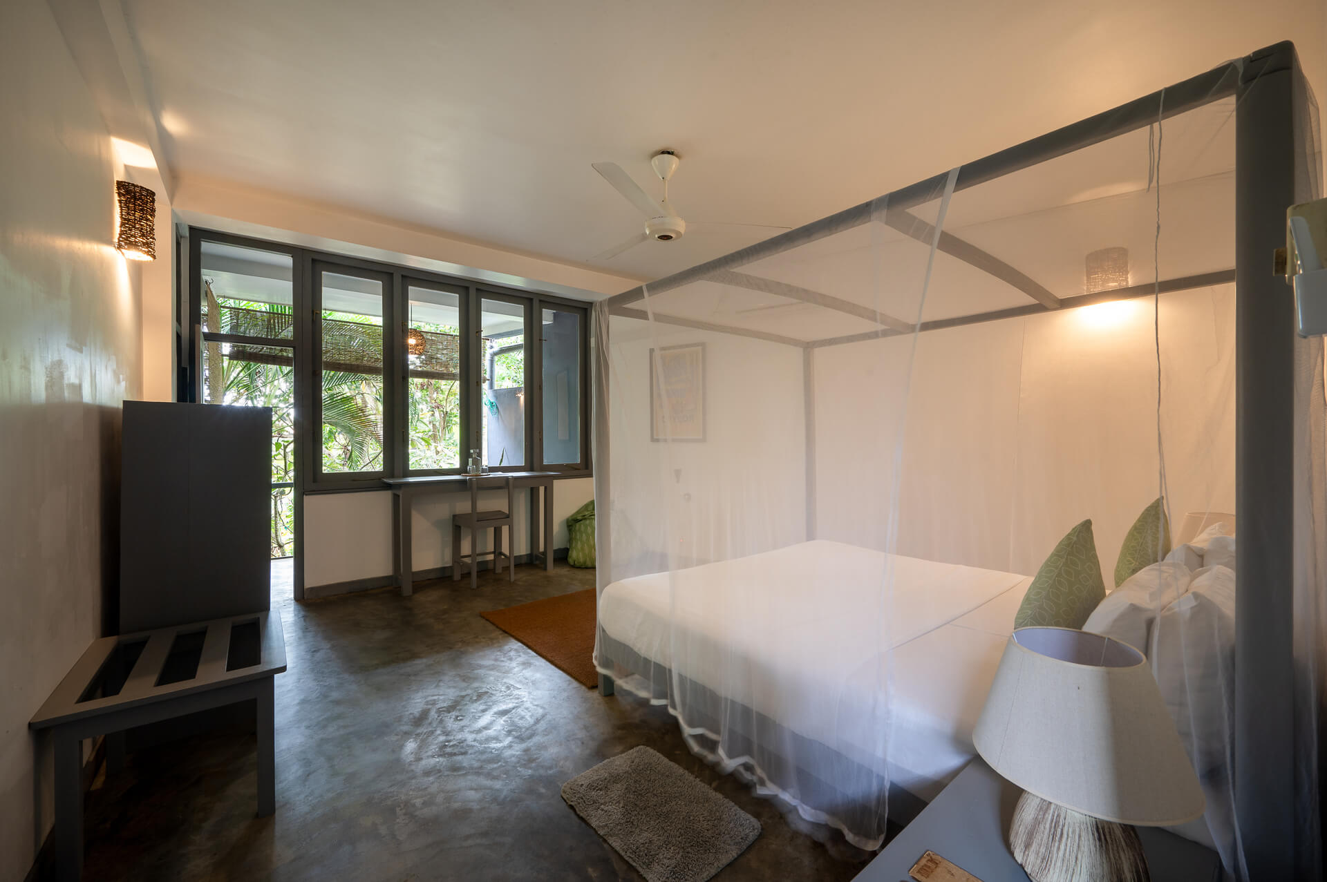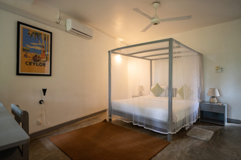 This Air Conditioned first floor room is spaciously designed to view the lush jungle from the comfort of your patio. An afternoon sitting on the shaded patio lounge watching the wild life is a simple pleasure. A four post king bed with mosquito protection allows the breeze to pass through and gives a real sense of relaxing in the outdoors. The room has space enough to roll out your yoga mat for practice or meditation.